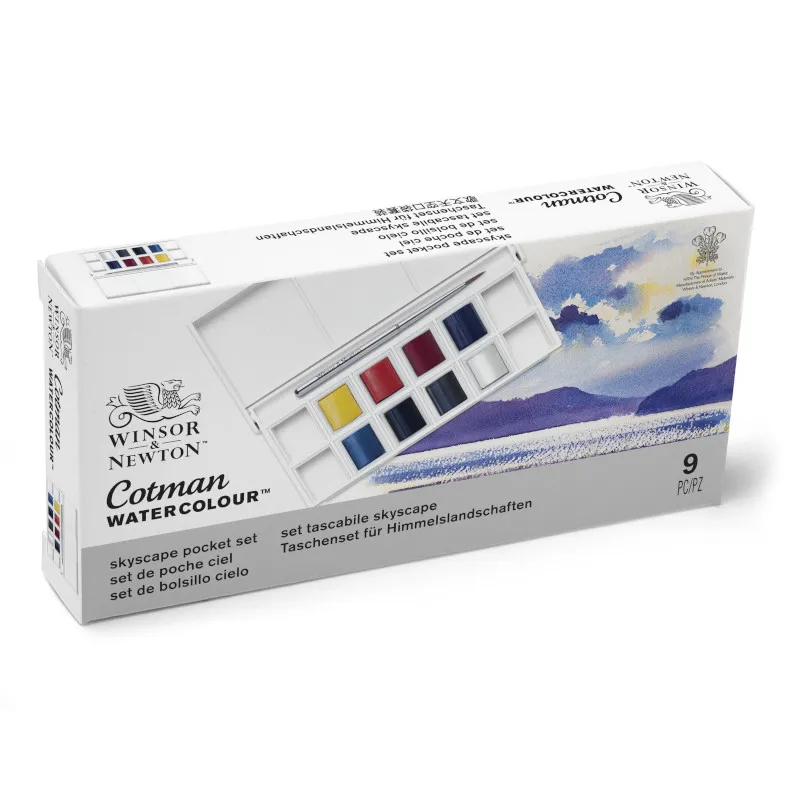 Winsor och Newton 8-set med färger för himmelsmålning är speciellt framtagna i samarbete med konstnärer. Settet innehåller 8 färger, ett praktiskt etui och en pensel. Ett perfekt set för resan eller som en present.Färger som ingår är: Lemon Yellow Hue, Cadmium Red Hue, Rose Madder Hue, Ultramarine, Cerulean Blue, Hue, Indigo, Payne's Grey, Chinese White