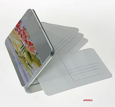 Plåtetui med 30 st akvarellpapper, i vykortsformat med rundade kanter och tryckta adressfält.