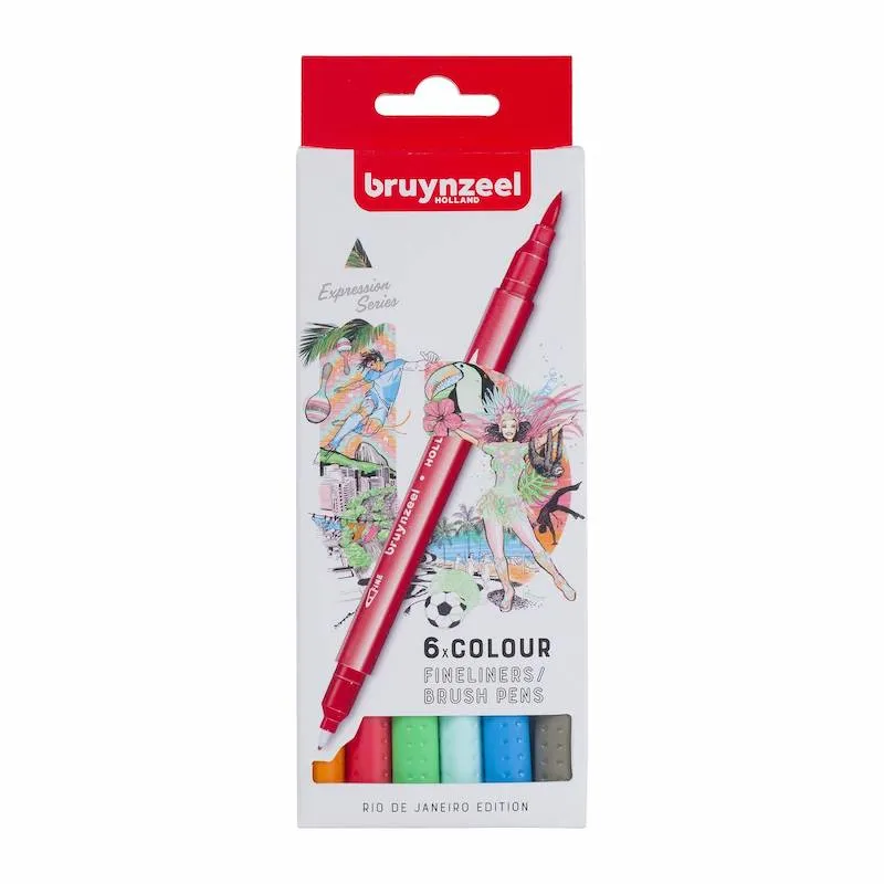 Fineliner / Brushpenset är ett temaset med 6 fiberpennor. Pennorna har dubbelspets i Rio De Janeiro-inspirerade färger. Penselspets och en fiberspets 0,4 mm. Vattenbaserat pigmenterat bläck. Glutenfri.