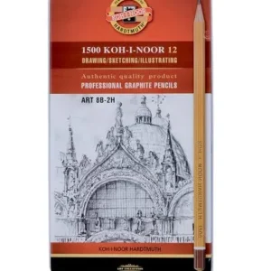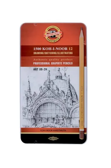 Plåtetui med 12 olika tecknarpennor, 8B - 2H.Tjeckisk tecknarpenna i bra kvalitét.