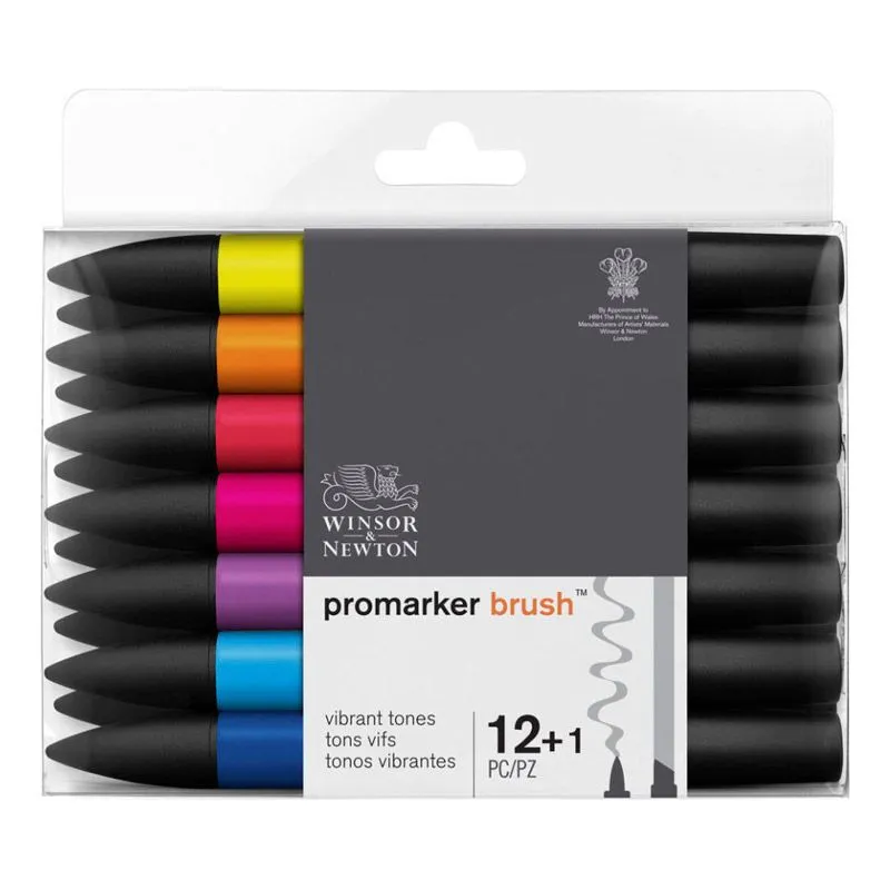 2-spets-marker pensel/flatVibrant Tones; 12 st + blender. - Yellow, Pumpkin, Red, Rouge, Magenta, Purple, Cyan, Royal Blue, Bright Green, Lush Green, Cocoa, Warm Grey 5, Black + Blender